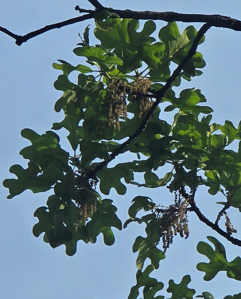 Chill rises with morning air to wipe a smooth surface across deeper recesses of Lake Jocassee. Sun has risen behind these steep, worn mountains, but here, where ancient river follows an ancient path, light is subdued. Then river bends around mountain, and rays of sunshine stream through trees, illuminating water dusted white with pollen from a forest full of oak trees. With each puff of breeze, every dangling catkin releases thousands of fine, dusty pollen grains, which hang invisibly in cool, dry air until some hapless boater comes along and inhales the suspended particles. Itchy eyes, watery nose, and sneezing commences. One wonders whether beings other than humans are affected by this unfortunate bounty of nature. ~K